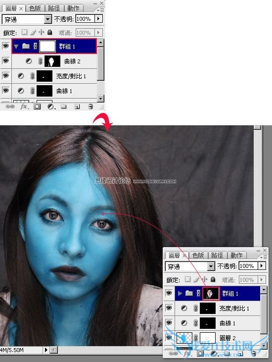 把刚【曲线调整图层】放到群组中,并将该群组建立一个图层遮色片,先将图层遮色片填满黑色,再利用笔刷以及白色,将脸部中的眼窝、鼻子二侧的暗面作出来。