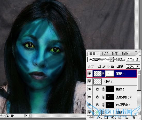 涂完后并在该图层建立一个遮色片,将刚所涂的蓝绿色,遮掩一些掉让蓝绿色与塬本的底色更调合 。
