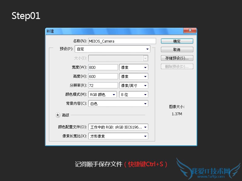 点击 — 【文件】— 【新建】(快捷键Ctrl+N)新建一个新的图像,命名好并把宽度设置为800px,高度为600px,分辨率为72dpi,然后点击确定,记得顺手保存文件(快捷键Ctrl+S)。