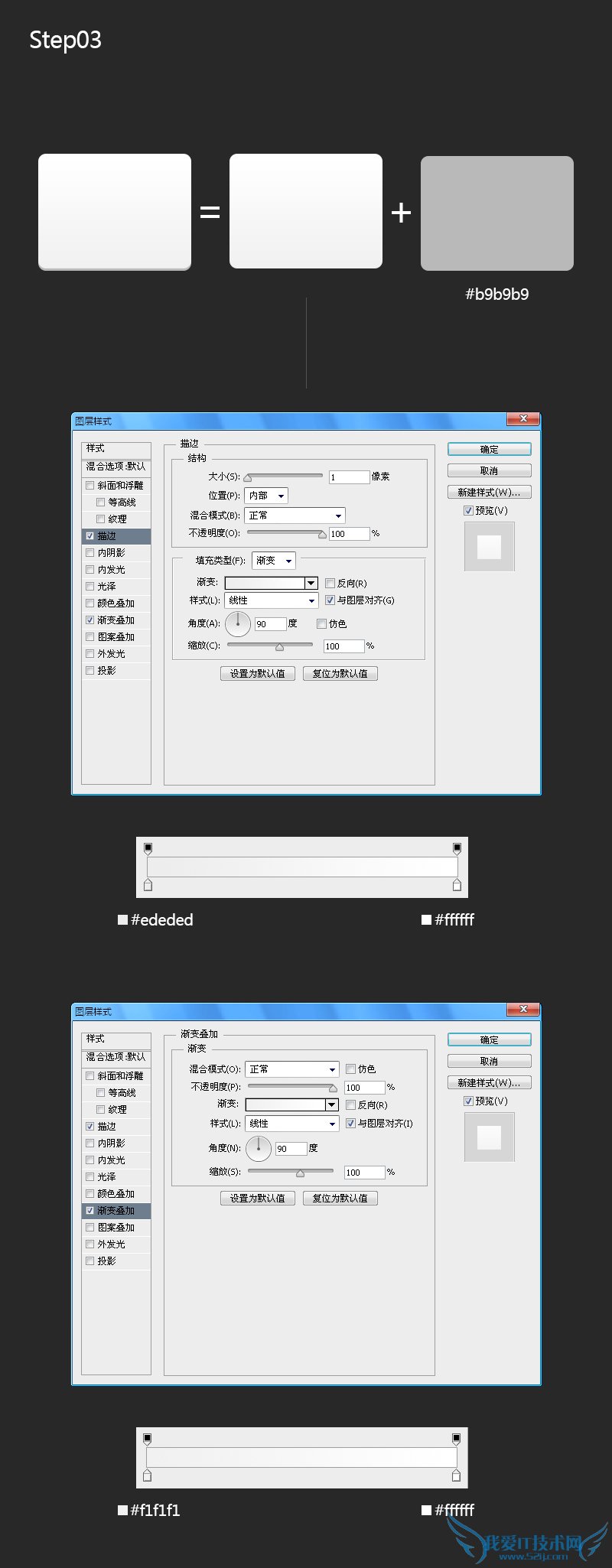 【描边】:大小为1,位置内部,填充类型为渐变,色值从上到下为 #ededed — #ffffff,角度为90°
