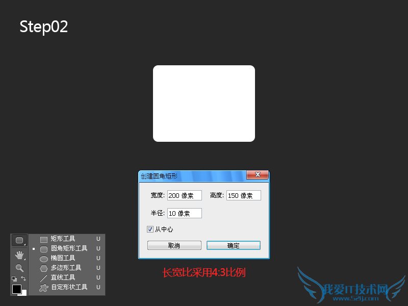 选择【圆角矩形工具】(快捷键U,可按Shift+U切换),在画布点击【创建圆角矩形】弹出层,设置宽度为200px,高度为150px,半径10px,并勾选【从中心】,然后点击确定;(PS:因为是不规则形状的主题图标,长宽比采用4:3比例)