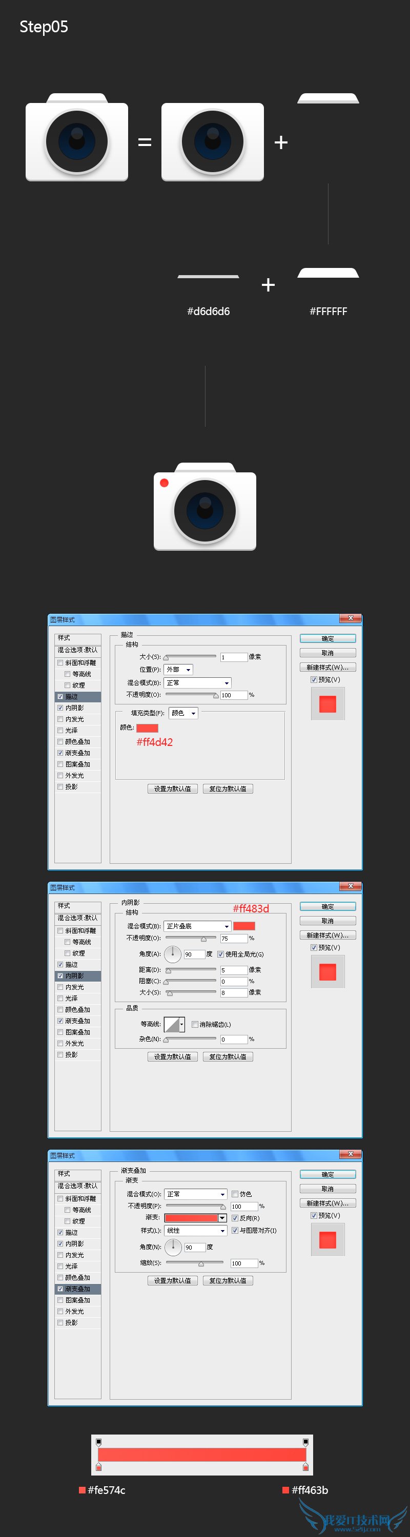 最后绘制相机的小红点,用【椭圆工具】画个正圆,大小自定,放在相机的左上角位置,设置图层样式: