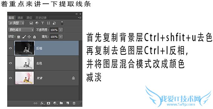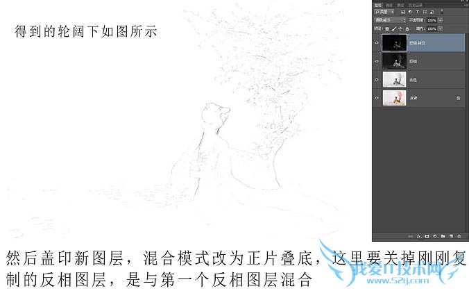 2、着重点来讲一下提取线条:首先复制背景层Ctrl + Shift + U 去色,再复制去色图片Ctrl + I 反相,并将图层混合模式改成“颜色减淡”。