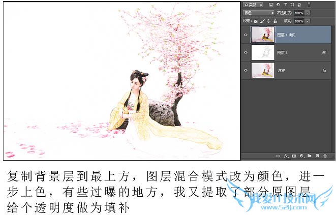 8、复制背景层到最上方,图层混合模式改为“颜色”,进一步上色,有些过曝的地方,我又提取了部分原图层给个透明度做为填补。