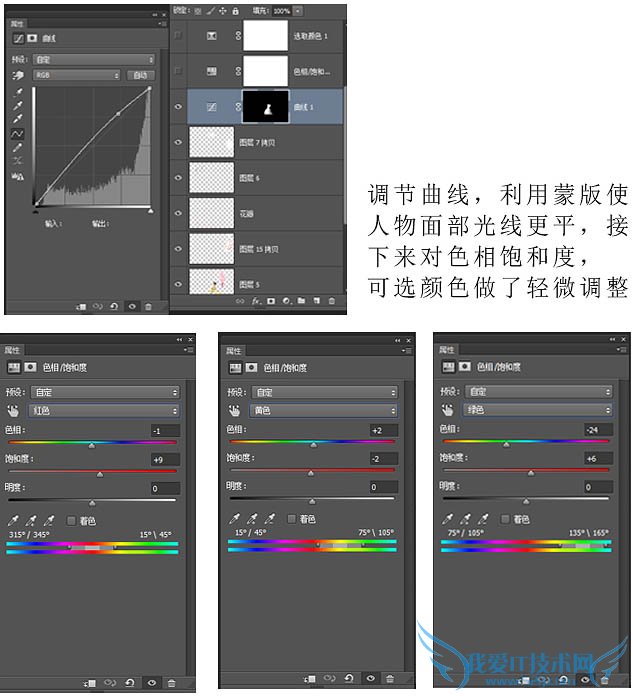 10、调节曲线,利用蒙版使人物面部光线更平,接下来对色相/饱和度,可选颜色做了轻微调整。