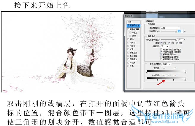 7、接下来开始上色:双击刚刚的线稿层,在打开的面板中调节红色箭头标的位置,混合颜色带一下图层,这里按住Alt键可使三角形的滑块分开,数值感觉合适即可。
