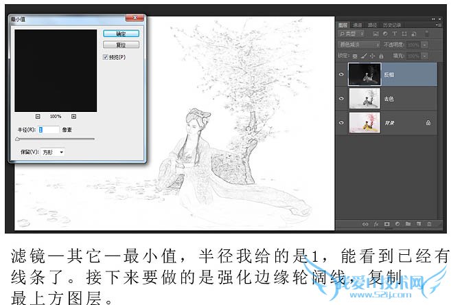 4、滤镜 > 其它 > 最少值,半径我给的是1,能看到已经有线条了。接下来要做的是强化边缘轮廓线,复制最上方图层。