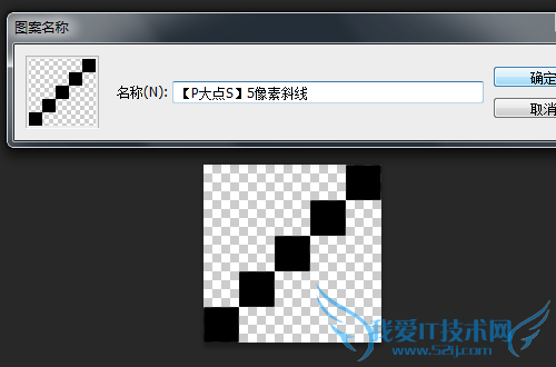 下面,我们制作原图中的像素斜线,新建个5像素*5像素的文档,放大画布到最大,用铅笔工具,设置铅笔像素大小为1像素,画出如下图案,记得把文档的背景图层删除掉,我们只要那个斜线图层。