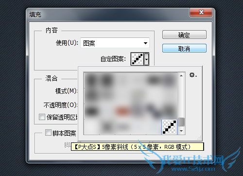 回到我们的文档,在“杂色”图层上层,新建个图层,执行“编辑—填充”,选择使用图案填充,找到刚才我们自定义的那个图案,确定。