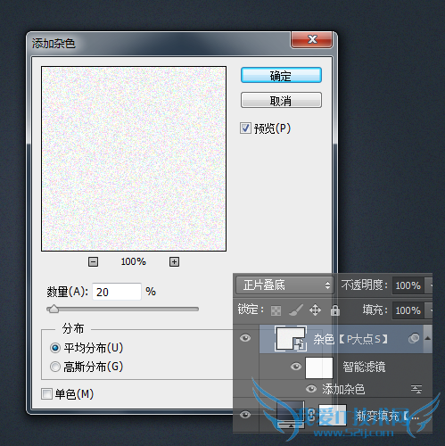建个新图层,填充白色,执行“滤镜—杂色—添加杂色”,设置杂色数量为20%,平均分布,并将这个图层混合模式更改为“正片叠底”。