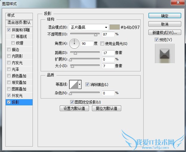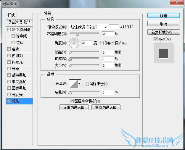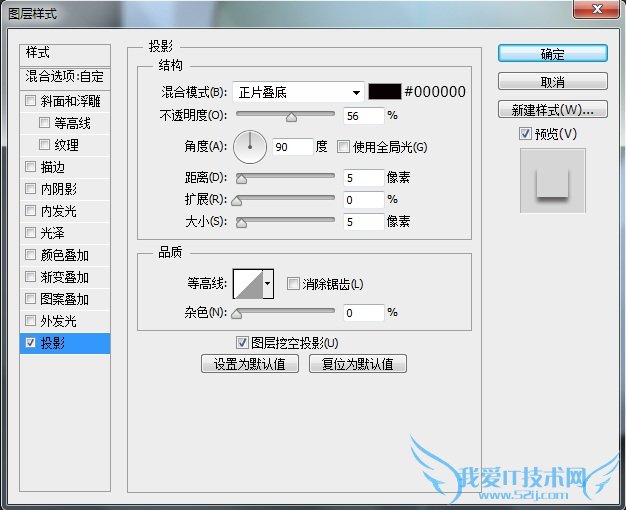 复制一层“按纽”图层,更改图层名为“投影”,将图层填充设置为0,再添加一个图层样式,我们来增强下投影效果。