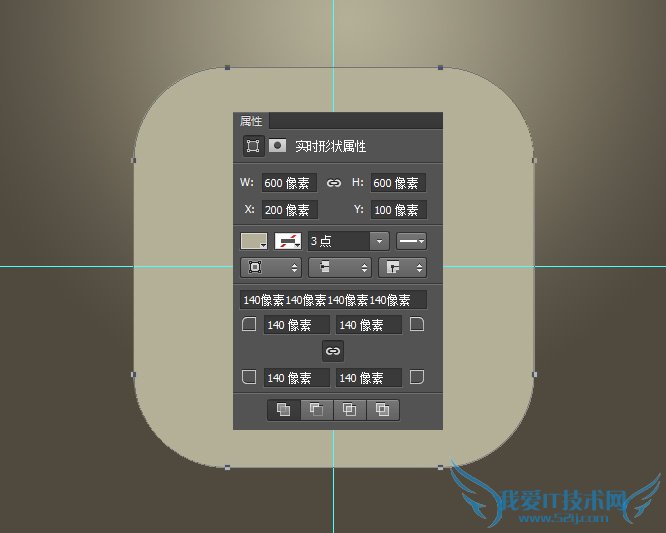 使用圆角矩形工具画一个600*600像素的圆角矩形,设置圆角为140像素,设置水平居中,垂直居中。