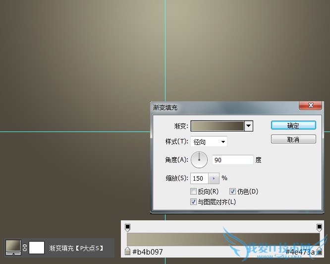 新建一个1000*800的文档,添加一个渐变调整层,做一个#b4b097到#4e473a的90度的径向渐变,设置缩放为150%,勾选仿色,防止出现色块。