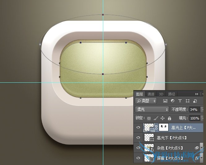 设置前景色为#eaead2,用屏幕的那个圆角矩形和一个椭圆相交,得到我们需要的屏幕顶部的高光形状,同样的将图层混合模式更改为“柔光”,不透明度34%,并添加一个图层蒙版,适当的擦拭左右两侧。