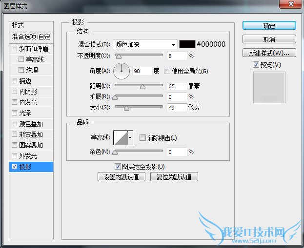 复制一层“主体”图层,更改图层名为“投影”,将“投影”图层置于“主体”图层下层,将图层填充设置为0,再添加一个图层样式,我们来增强一下投影效果。