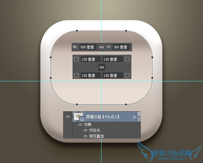 原图画的是一个类似椭圆的形状,我这里偷懒一下,还是画的圆角矩形,大小为500X360像素,圆角半径为130像素,添加一个图层样式。