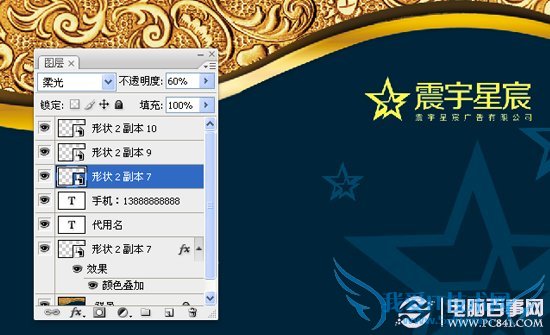 第六步:此时我们看右下角有些空--我们把标志复制几个--模式改为柔光--不透明度改为60%--如下图