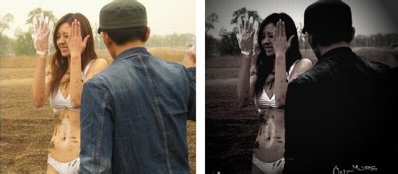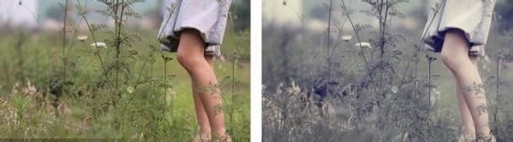 1.建立色相饱和度调整图层,饱和度-49, 2.建立可选颜色图层,红色:-49,0,+7,-41.黄色:0,0,0,-23 3.建立色相/饱和度图层,明度-49 4.可选颜色。黄色:0,0,0,-26.白色:0,0,+46,0。中间色:0,0,-6,0. 5.可选颜色。红色:0,0,0,-48.黑色:0,0,-47,+5.透明度降低到37% 6.盖印,降噪,锐化,用涂抹和简单工具修复膝盖附近的光斑, 7.加暗角,制作一个心形选区,羽化,用曲线提亮。