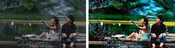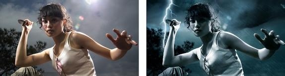 1.复制图层,调整亮度对比度,向下合并, 2.进入LAB模式,选择图像中的应用图像,进行计算, 3.将图层模式改成颜色,盖印图层, 4.进入RGB通道,将蓝通道填充黑色,提取绿通道选区,将选区填充白色, 5.色相饱和度,红色:+20,+1,0.青色:-7,+26,0.其他数据不动,将该图层模式改成颜色, 6.进入RGB通道,选取绿通道选区,进行反选,调整层中的色彩平衡,选择中间调,数值:-10,-6,+16.阴影:+4,+5,-2.高光:-19,-26,-40 7.盖印图层,进入RGB通道,选取红通道选区,复制,回到RGB模式粘贴,图层模式改成颜色,选取调整层中的曲线,红通道:173,193。红通道:58,56.绿通道:180,201.绿通道:53,58.蓝通道:55,62. 8.将图层模式改成颜色,复制该图层,在复制该图层,图层模式改成亮度,透明度20% 9.选取调整层中的色相饱和度,青色:+5,-49,-2。10.调整调整层中的色彩平衡,中间调:-6,0,+3.阴影:-7,+3,-1. 11.色彩平衡,阴影:+4,+5,-2。阴影:+4,+5,-2.高光:-19,-26,-40. 12.加上闪电效果。