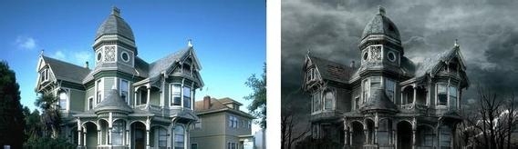 1.将照片打开,找一些造型类似古堡的。 2.将房子扣离并放到一个新的层中。可以使用多边形套索工具选择房屋,并通过一个较柔软的橡皮擦工具擦除背景。 3.现在需要一个新的背景,从素材库中挑一张 4.将天空放到房子的后面(天空层放到房屋层的下面),并为天空添加一点透视变形效果来增加背景的深度。 5.观察房子的边缘,这里仍有一些原来天空的颜色留在上面。 6.用魔棒选择房屋层空的地方,然后执行 Select > Modify > Expand 命令来扩大选择范围,输入一个合适的数值使选择范围能够包含到需要校色的房子边缘。执行Image > Adjust > Hue / Saturation 命令,将边缘的颜色调整为与屋顶的颜色一致。 7.继续使用 Hue / Saturation 来调整房屋和天空的颜色,使它们能够协调地互相融合。8.将要去掉挨着房子的棕榈树,用复制图章工具,复制房子的瓦片来绘制出一层和二层之间的部分。 9.添加一道闪电来为画面增添紧张感。使用没有羽化效果的笔刷绘制一道闪电,复制到一个新层,添加辉光效果。然后使用减淡工具加亮闪电根部的云层。 10.使用图片或手工绘制在房屋周围添加一些枯死的树,记得要调整好颜色和亮度。 11.为了让房子看上去更破旧,在屋顶上绘制了一个破洞。 12.继续添加破损的效果。弄断横梁和导水管,打破了另一个屋顶和玻璃。打破东西后,要用复制图章工具把空出的地方补上 13.添加一些污渍。首先是窗户,用一个不规则的笔刷为玻璃添加一些杂色。然后改变污渍层的图层混合模式使其与玻璃能够很好的混合在一起。本教程中我使用了亮度模式。 14.对整个房子重复同样的步骤,使用更深一点的颜色并将图层混合模式设为叠加模式。注意接缝和边缘,这种地方最容易产生污渍。 15.门廊细节的放大。