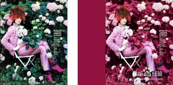1.复制图层,转入通道,复制红色通道,曲线调整红色通道副本,输入100,输出3, 2.用画笔或选取工具,把人物和花填充白色, 3.Ctrl+点击红副本,使其变为选区,删除红副本,返回图层面板, 4.Ctrl+C复制,Ctrl+V粘贴,人物和花抠图完成, 5.方法一:新建填充图层,R=255,G=128,B=173,图层改为颜色模式, 6.方法二:饱和度着色法,新建色相饱和度调整图层,着色前面打勾,色相=345,饱和度=60,明度=0,新建曲线调整图层,237,255;188,130 7.方法三:新建色彩平衡图层,中间调-色阶:+100,-54,-20/+100,-35,+43 阴影-色阶:+11,-7,+3.新建可选颜色调整图层,红色:0,+21,-23,-5.洋红:-100,-45,+32,-1 8.渐变映射运用,新建渐变映射1,图层改为颜色。