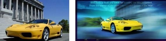 1.复制图层,滤镜-模糊-径向模糊:数量71,模糊方法-缩放,品质-好, 2.建立模板,擦出汽车,再用涂抹擦出轮子的动感, 3.色阶-可选颜色。加素材,渲染整体气氛,同减淡做细节调整,主直径5之内,硬度最小。