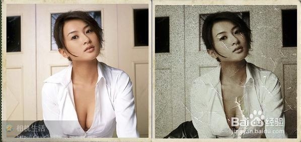 1.找一张皱折的背景,将需要制作的照片拖入背景层,调整尺寸并裁剪,使之与背景边框相配, 2.调整-色相饱和度,全图:饱和度-35,明度+10, 3.调整图层改成柔光模式,出来旧照片的效果了, 4.色相饱和度,全图:0,-80,0 5.复制图层,色相饱和度-着色:340,24,0 6.创建新图层,放在最顶端,填充黑色, 7.滤镜-杂色-添加杂色,增加陈旧感,数量25%,高斯分布, 8.混合模式为正片叠底, 9.图像-调整-反相, 10.将边框中的杂色去掉,用矩形选择工具选边框内侧边,DEL键删除轮廓部分的杂色, 11.用橡皮擦工具擦出人物周围的杂色。