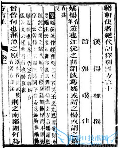 每年的八月,汉朝廷都会派人去到各地搜集方言。扬雄的老师、亲戚平时都有收集方言的习惯,耳濡目染的,扬雄也对方言有着浓厚的兴趣。《方言》是中国语言学史上对词汇进行专门研究的著作,在世界语言史上也开创了新河。《方言》按卷来分,前后分为动词、名词、形容词,衣服、器皿、家具,兵、车、船,昆虫等,涉及面十分广。除了当时使用的方言,《方言》里还收录了古方言,对单个词汇的历史了解深远,用平日里通俗易懂的词语来解释,让人便于理解。