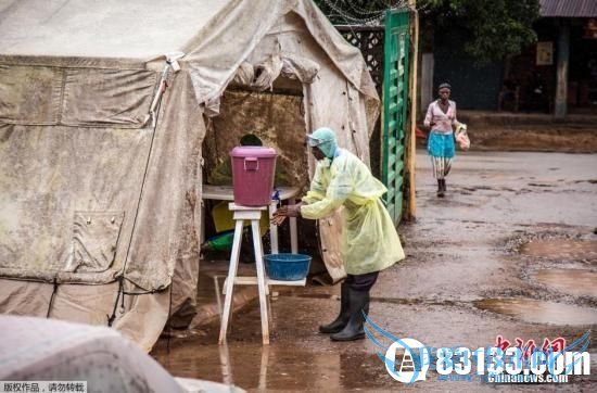 资料图:当地时间2014年8月11日,塞拉利昂凯内马,凯内马医院,一名医护人员在进入埃博拉病患帐篷前,用经过氯消毒的水洗手。