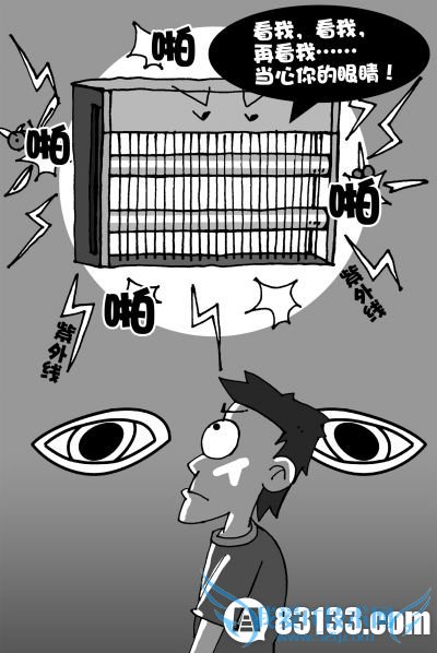 漫画陶刚 两名护士在开了紫外线灯的配药室里工作一个小时,下班回家后眼睛疼痛不止,到了凌晨竟然啥也看不见了。18日,两人来到同济医院眼科就诊。眼科医生刘恒明提醒说,这是电光性眼炎造成的暂时性失明。除了消毒用的紫外线灯,灭蚊灯和验钞机都有紫外线,对眼睛的伤害较大。
