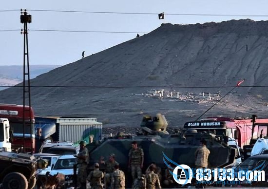 资料图:极端武装分子占领了土耳其-叙利亚边境的一座山头升起黑旗,下方为土耳其安全部队