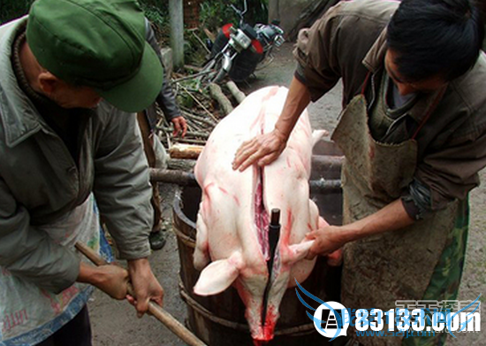 开始的时候,这位杀猪先生(以后简称屠夫)直接把一个大铁钩按在那个猪的嘴里,勾住舌头底下往外拉。一拉,猪就知道它要完了,所以就开始叫,死活不走。前面拉,后面推。到大门口。屠夫就拿起了大锤,砸猪头。