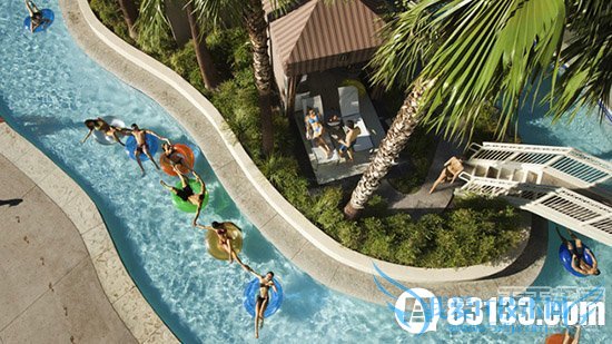 格兰德维里亚度假村流经的河流可以连接九个游泳池,有激流、缓流、四处滑水道,泰山泳池上修建有秋千,另外这里还有瀑布和三个按摩浴缸。