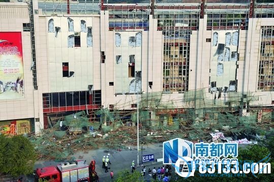 消防部门接到报警后,马上调度3个中队5台消防车20名官兵前往现场处理。10分钟后,辖区中队太和中队到达现场,当时高四层、宽约三十米的建筑外墙脚手架已经坍塌,钢筋、水泥、墙砖等掉落一地。