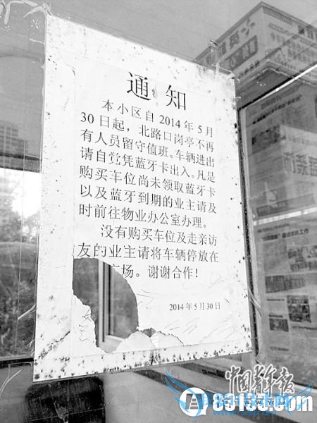 ¡¡¡¡½ñÄê10ÔÂ23ÈÕ£¬ÖйúÇàÄ걨¼ÇÕßÔÚÐ¡ÇøÏÖ³¡¿´µ½£¬±±Â·¿Ú¸ÚͤÒѾÎÞÈËÖµÊØ£¬¸ÚͤÉÏÌù×ÅÒ»ÕÅÂä¿îΪ¡°2014Äê5ÔÂ30ÈÕ¡±µÄ֪ͨ£º¡°±¾Ð¡Çø×Ô2014Äê5ÔÂ30ÈÕÆð£¬±±Â·¿Ú¸Úͤ²»ÔÙÓÐÈËÔ±ÁôÊØÖµ°à¡£³µÁ¾½ø³öÇë×Ô¾õƾÀ¶ÑÀ¿¨³öÈ롡ûÓйºÂò³µÎ»¼°×ß·ÃÇ×ÓѵÄÒµÖ÷Ç뽫³µÁ¾Í£·ÅÔÚÉÌÒµ¹ã³¡¡£¡±