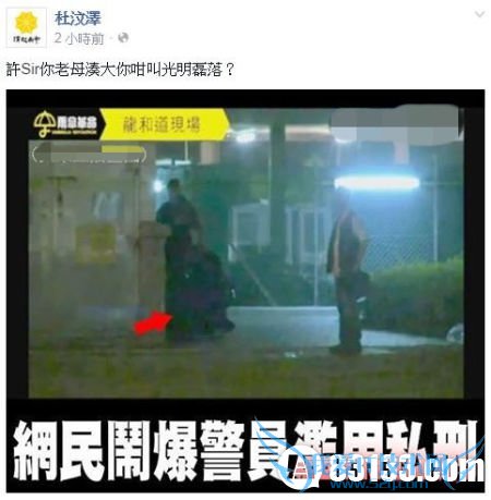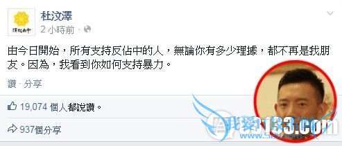 新浪娱乐讯 据香港媒体报道,香港警方再度以胡椒喷雾强制驱离占中民众,甚至传出有警员将示威者拉到暗角毒打数分钟,杜汶泽怒在脸书说:“由今日开始,所有支持反占中的人,无论你有多少理据,都不再是我朋友。因为,我看到你如何支持暴力。”同时,他质问代表警方发言的警察公共关系科总警司许镇德:“许Sir你老母养大你这样叫光明磊落?”