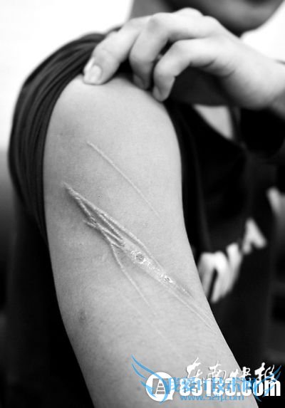 昨日上午,在东南快报社里,他撩起袖子给东南快报记者看他的伤口,“这样警察和医生打电话给我父母时,他们看到我‘被人砍’了,就会震惊到。”