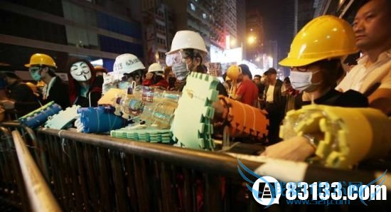 10月19日深夜,有滋事分子通过网络发起再次到旺角冲击警方防线。其中违法“占中”集会者除了戴上眼罩、口罩和头盔等基本装备外,还有人把胶卷成筒状包裹双手,同时绑上饮料瓶等物品作防御,以同警察对抗。 中新社发 洪少葵 摄