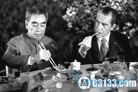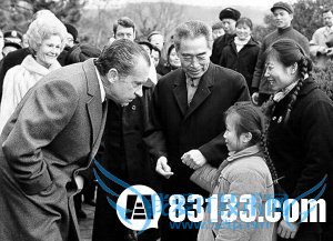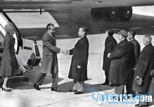 1972年2月21日上午11时30分,尼克松乘坐的专机抵达北京首都机场,周恩来等亲临迎接。尼克松从舷梯走下,周恩来迎上前去,两人热烈握手。周恩来寓意深刻地说:“你的手伸过世界最辽阔的海洋来和我握手。”后来,尼克松也在文章中写道:“当我们的手相握时,一个时代结束了,另一个时代开始了。”