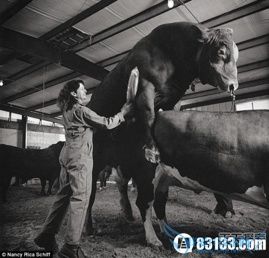 一名女性工作人员在提取公牛的精液。摄影师看到这一情景都不可思议。