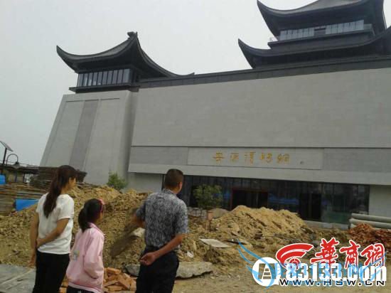 随后,王媛媛一家人在15点时骑电动车又到新馆参观时,仍然发现这里也在施工。多名建筑工人或用铁锨铲除渣土,或用架子车运送砂石,或正在粉刷墙壁。