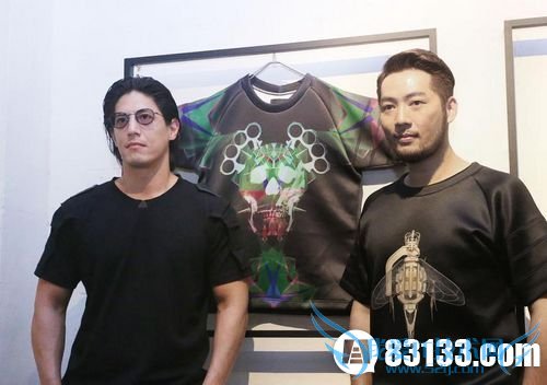 橙果广告设计公司创办人蒋友柏(左)20日举办服装品牌BOU发表会,邀请服装设计师黄嘉祥(右)担任设计总监,以蒋友柏个人形象做为设计的缪思,打造以战争为主题的系列男性服饰。 中新网10月20日电 据台湾“中央社”报道,平常不爱露面的蒋家第四代蒋友柏,今天发表自己的男装品牌BOU时大方受访谈时事,说自己买不起房,做事业要对得起自己良心,才能安稳睡觉。