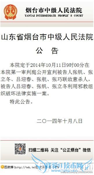 微博截图 中新网10月8日电 据山东省烟台市中级人民法院官方微博消息,烟台中院定于10月11日9时在该院第一审判庭公开宣判被告人张帆、张立冬、吕迎春、张航、张巧联故意杀人,被告人吕迎春、张帆、张立冬利用邪教组织破坏法律实施一案。