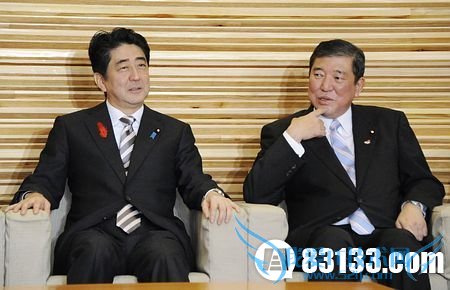 10月10日上午,在内阁会议开始之前,石破茂(右)与安倍晋三(左)谈诺贝尔和平奖问题。 中新网10月10日电 据日本时事通讯社10日报道,就日本国民坚持了规定放弃战争的《宪法》第九条,成为2014年诺尔贝和平奖获奖候选人一事,首相安倍晋三与地方创生担当相石破茂均认为和平奖的选拔带有“政治性”。