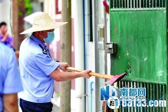 资料图:月17日,广州南田路昆仑一街,警察用斧头凿开铁门,取走“9·16”缉毒枪战留下的子弹。