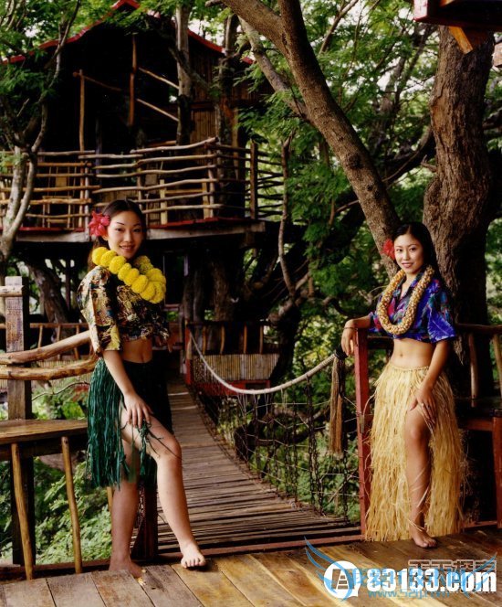 四个巨大繁茂的大树支撑起各个树屋客房。这里最大的是一个两层楼的树屋,只能通过旁边的吊桥才能走到这个树屋里,能够承受20个人的重量,由美国设计师设计,用的全是天然原料。