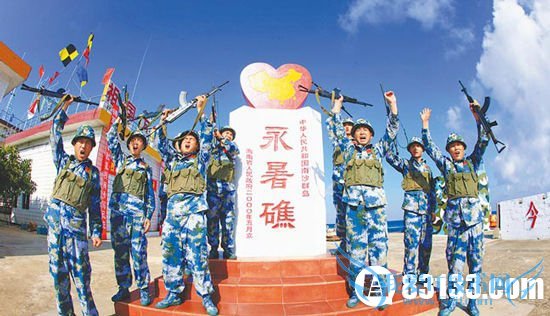 驻守在永暑礁的大陆海军官兵在主权碑前欢呼。