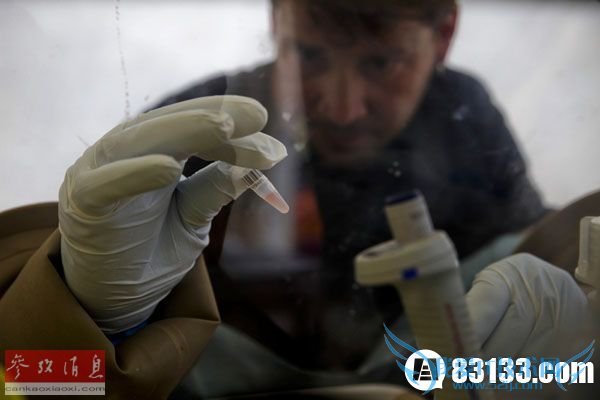2014年4月3日,在几内亚盖凯杜,一名科研人员手持埃博拉病毒样本进行检测。(资料图) 参考消息网9月20日报道 美国《纽约时报》网站9月18日发表题为《对埃博拉的害怕促使暴徒杀死了几内亚官员》的文章称,政府发言人18日表示,致命埃博拉病毒席卷了几内亚边远乡村,一个代表团被派往该地消除谣言,而暴徒声称他们是来传播疾病的,该代表团遭到暴徒石块投掷袭击,其中8名官员和记者的尸体已经被发现。