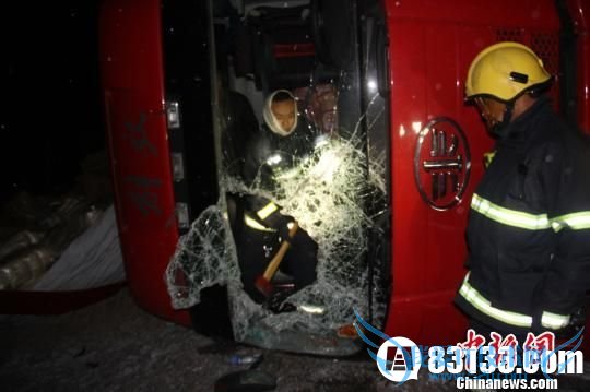 在该路段,离大客车1公里处一辆半挂车侧滑在路基下面,司机被卡在驾驶室内,消防人员再利用破拆工具对半挂车的驾驶室进行破拆,然后将被困司机救出,该半挂车司机并无大碍。