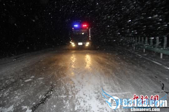 图为救援路上雪花飞舞。 孙亭文 摄 中新网乌鲁木齐10月9日电 (孙亭文袁祥建)记者从新疆博州消防支队获悉,截至9日清晨7点30分左右,参与连霍高速乌鲁木齐往伊犁方向4157公里处大客车侧翻事故的博州消防人员返回。